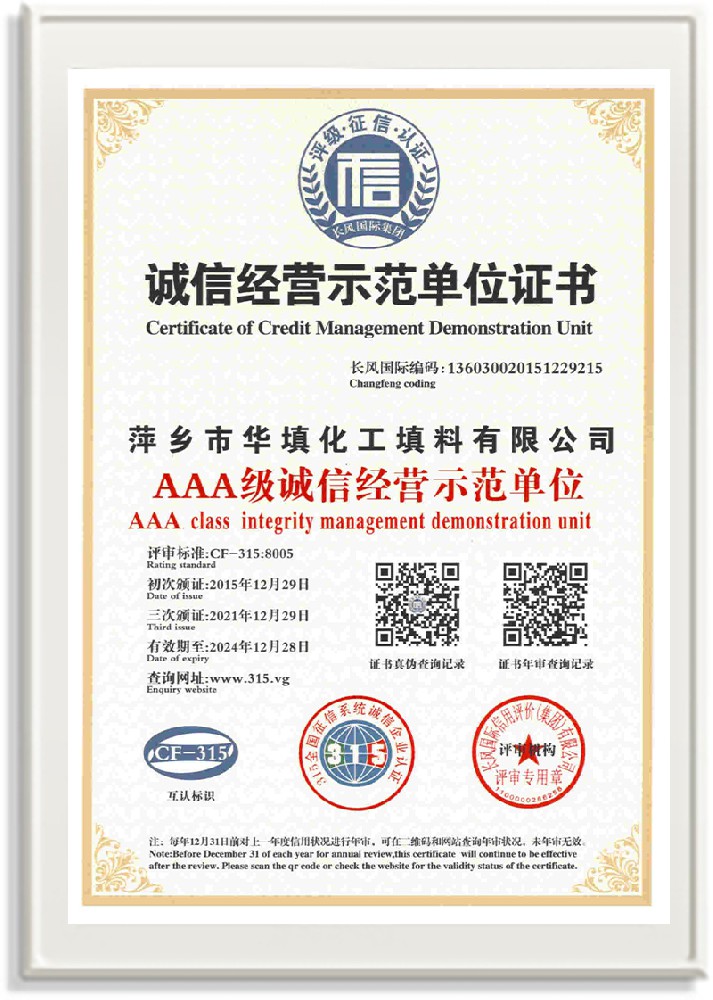 萍鄉(xiāng)市華填化工填料有限公司,位于320國(guó)道、109國(guó)道、浙贛鐵路、昌金高速公路貫穿其中,交通便利,是江西西部一顆燦爛明珠,創(chuàng)建于20世紀(jì)70年代初期,是中國(guó)石油天然氣股份有限公司“能源一號(hào)網(wǎng)”會(huì)員企業(yè)、中國(guó)石化物資采購(gòu)電子商務(wù)網(wǎng)絡(luò)和中國(guó)海洋石油總公司采辦業(yè)務(wù)系統(tǒng)成員單位,是上海大學(xué)江西材料基因組工程產(chǎn)業(yè)研究院工業(yè)陶瓷產(chǎn)業(yè)創(chuàng)新聯(lián)盟基地,且通過ISO9001:2015質(zhì)量管理體系、ISO14001:2015環(huán)境管理體系、ISO45001:2018職業(yè)健康安全管理體系認(rèn)證的化工填料生產(chǎn)企業(yè)。公司擁有陶瓷、塑料、金屬填料、催化劑、活性氧化鋁、分子篩等產(chǎn)品生產(chǎn)線,現(xiàn)有固定資產(chǎn)3616萬(wàn)元,占地面積3.8萬(wàn)平方米。公司具有悠久的生產(chǎn)歷史、雄厚的技術(shù)力量和先進(jìn)的生產(chǎn)工藝設(shè)備,可生產(chǎn)工業(yè)瓷球(支撐劑)、陶瓷、金屬、塑料質(zhì)的規(guī)整、散堆化工填料及分子篩、催化劑、生化濾料、活性氧化鋁、石化助劑、活性炭、環(huán)保材料、耐火材料等系列的200多種規(guī)格型號(hào)產(chǎn)品。